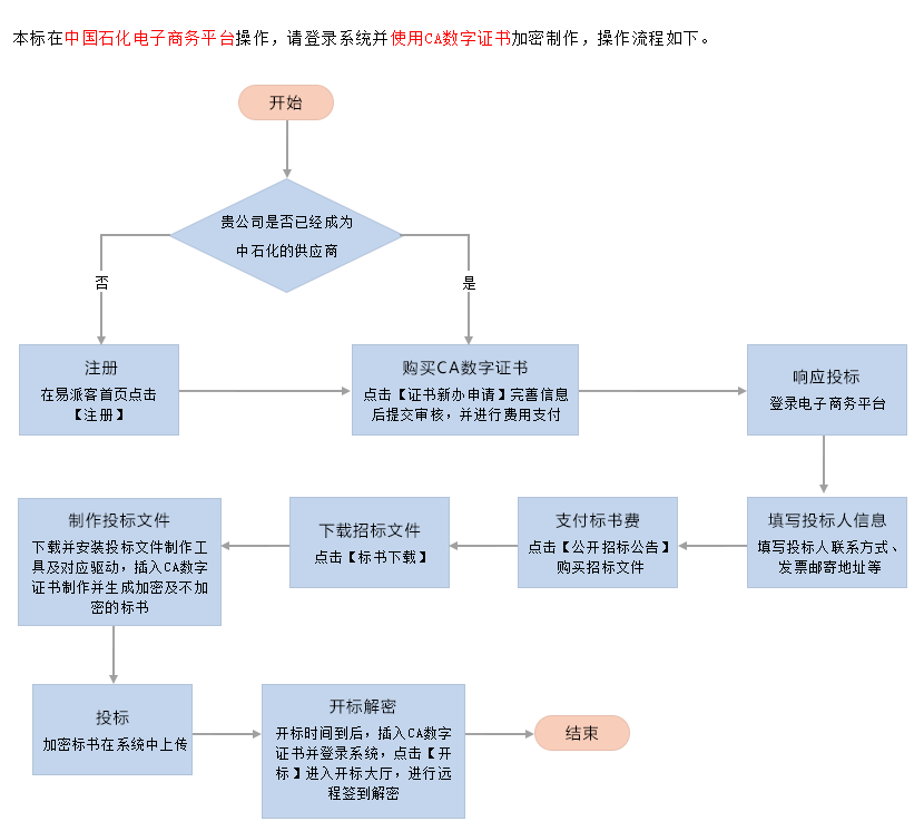 本標在中國石化電子商務(wù)系統(tǒng)(http://ec.sinopec.com/)操作,請登錄電子商務(wù)系統(tǒng)并使用CA數(shù)字證書加密制作,操作流程如下。