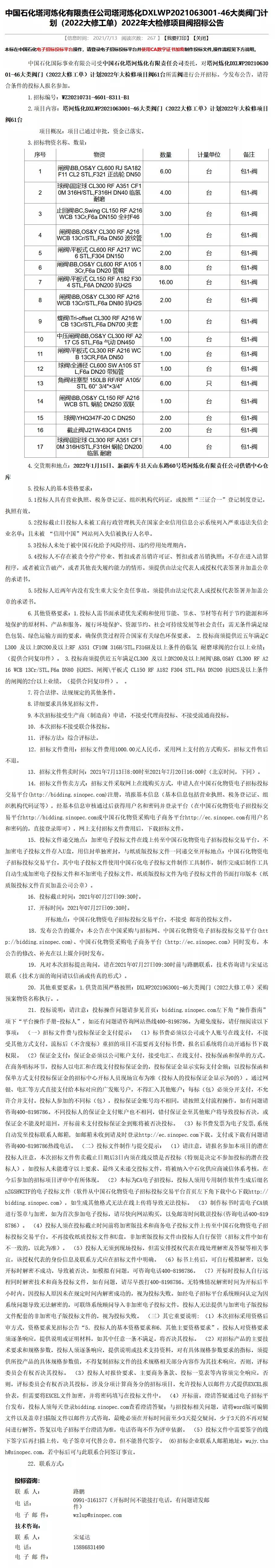 中國石化塔河煉化46大類閥門計劃(2022大修工單)項目閥招標公告