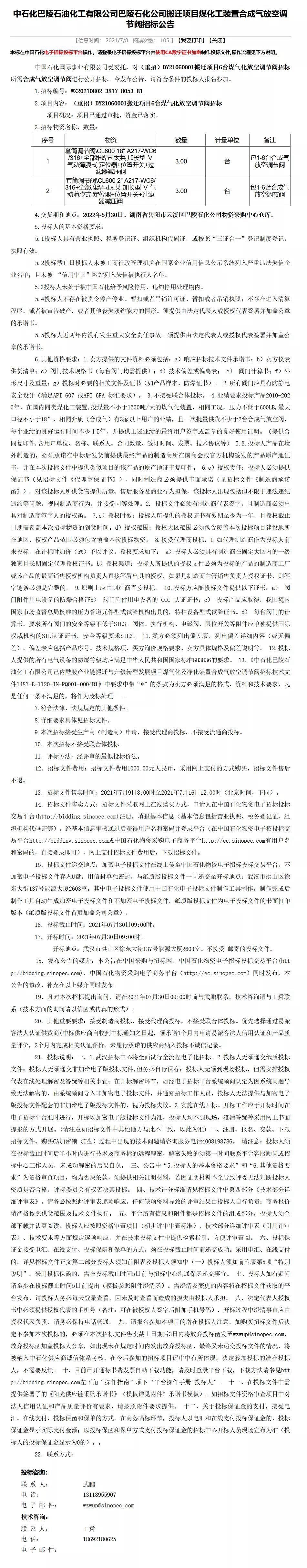 中石化巴陵石化巴陵石化搬遷項目煤化工裝置合成氣放空調(diào)節(jié)閥招標公告