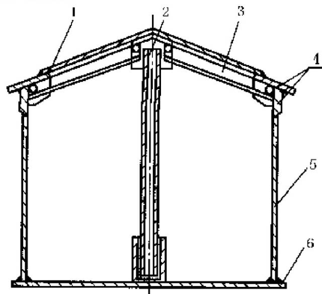 1-錐頂板,2-中間支柱,3-梁,4-承壓圈,5-罐壁,6-罐底