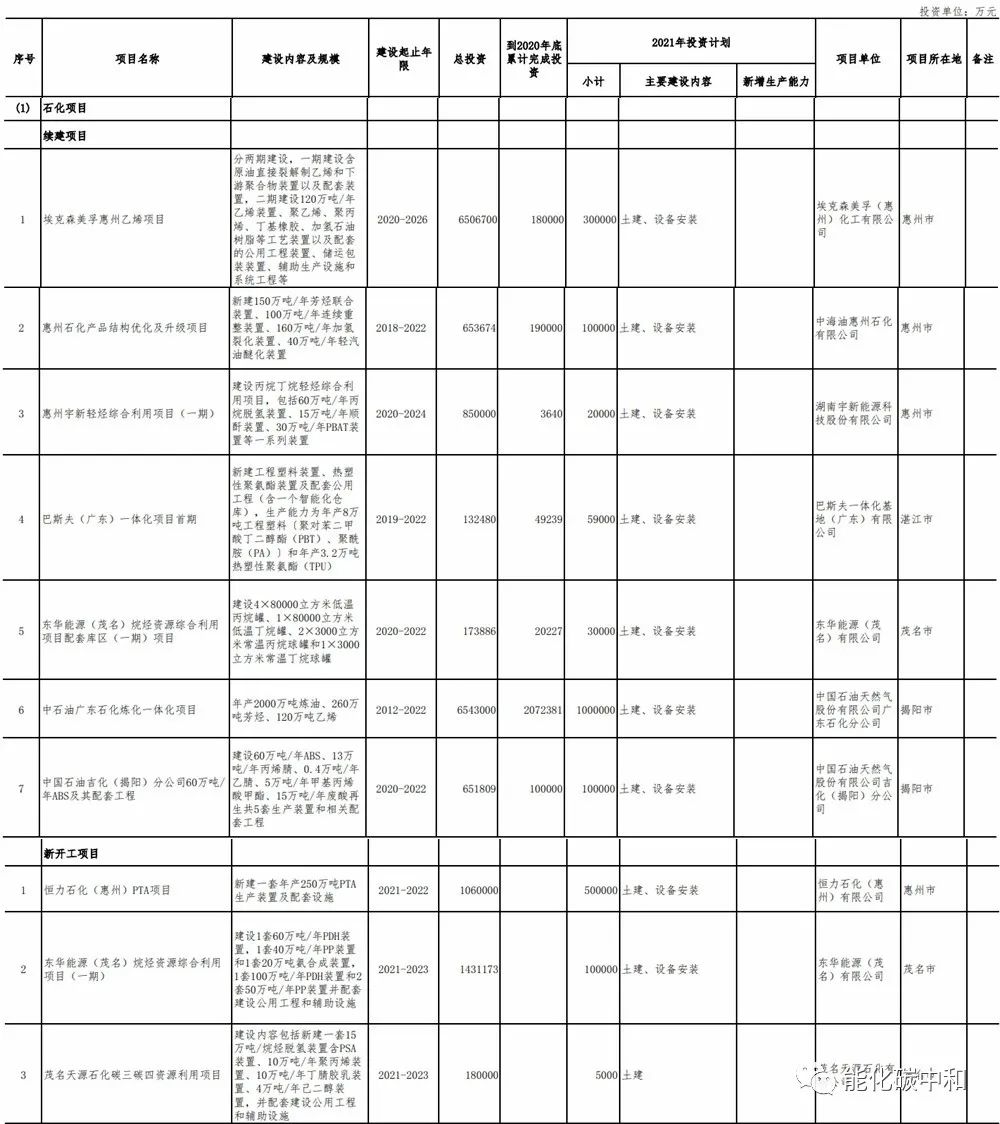 續建項目有7個,總投資超過1500億元,2021年度投資約160.9億元。分別是埃克森美孚惠州乙烯項目、惠州石化產品結構優化及升級項目、惠州宇新輕烴綜合利用項目(一期)、巴斯夫(廣東)一體化項目首期、東華能源(茂名)烷烴資源綜合利用項目配套庫區(一期)項目、中石油廣東石化煉化一體化項目、中國石油吉化(揭陽)分公司60萬噸/年ABS及其配套工程。
