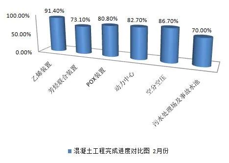 樁基完成85.8%;混凝土工程完成60.0%;地管完成55.8%;鋼結構安裝完成7.3%;現場儲罐安裝完成61.7%;其他各類工藝設備安裝完成4.6%。