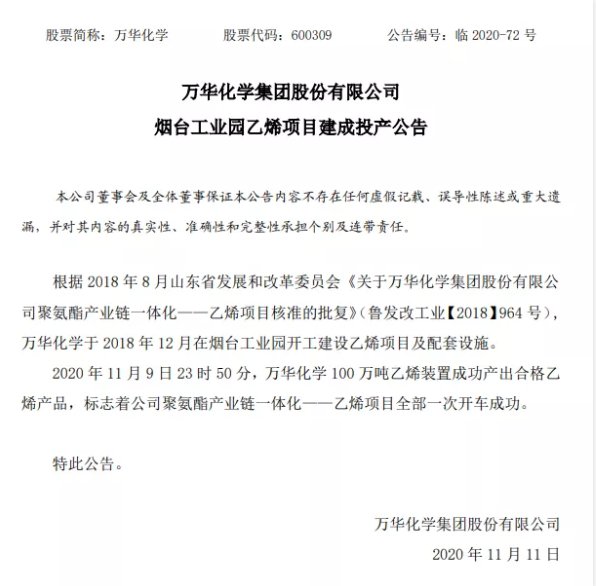 11月10日,萬華化學(xué)發(fā)布公告表示:11月9日23點54分,100萬噸/年乙烯裝置一次開車成功,生產(chǎn)出99.99%合格乙烯產(chǎn)品,至此,萬華化學(xué)聚氨酯產(chǎn)業(yè)鏈一體化——乙烯項目全部一次開車成功。