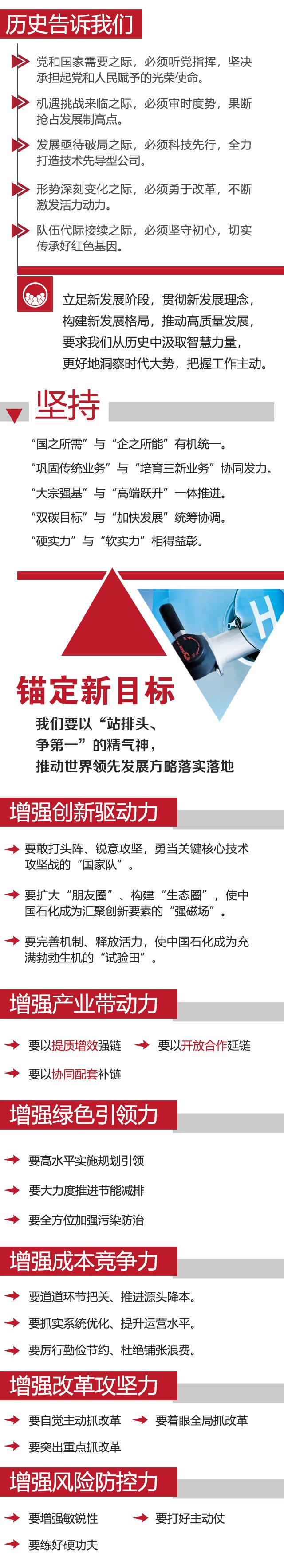 張玉卓要求,錨定新目標(biāo),以“站排頭、爭第一”的精氣神,推動世界領(lǐng)先發(fā)展方略落實落地。一要增強創(chuàng)新驅(qū)動力。敢打頭陣、銳意攻堅,勇當(dāng)關(guān)鍵核心技術(shù)攻堅戰(zhàn)的“國家隊”;擴大“朋友圈”、構(gòu)建“生態(tài)圈”,使中國石化成為匯聚創(chuàng)新要素的“強磁場”;完善機制、釋放活力,使中國石化成為充滿勃勃生機的“試驗田”。二要增強產(chǎn)業(yè)帶動力。更加自覺地扛起核心職責(zé),提升油氣、煉化、銷售業(yè)務(wù)發(fā)展質(zhì)量,以提質(zhì)增效強鏈;積極融入國家重大區(qū)域戰(zhàn)略,加強與地方和相關(guān)企業(yè)的戰(zhàn)略合作,共同培育現(xiàn)代產(chǎn)業(yè)集群,以開放合作延鏈;在關(guān)鍵基礎(chǔ)設(shè)施上補、在數(shù)字經(jīng)濟上轉(zhuǎn)、在國際化經(jīng)營上進(jìn)、在產(chǎn)融結(jié)合上促,以協(xié)同配套補鏈,在鍛造強韌高效產(chǎn)業(yè)鏈、建設(shè)現(xiàn)代化經(jīng)濟體系中展示更大作為。三要增強綠色引領(lǐng)力。高水平實施規(guī)劃引領(lǐng),大力度推進(jìn)節(jié)能減排,全方位加強污染防治,逐步實現(xiàn)化石能源清潔化、潔凈能源規(guī)模化、生產(chǎn)過程低碳化,使綠色潔凈成為公司的鮮明底色。四要增強成本競爭力。把增強成本競爭力擺在更加重要的位置,道道環(huán)節(jié)把關(guān)、推進(jìn)源頭降本,抓實系統(tǒng)優(yōu)化、提升運營水平,厲行勤儉節(jié)約、杜絕鋪張浪費,打造優(yōu)于同行的低成本優(yōu)勢。五要增強改革攻堅力。大力推進(jìn)深化改革三年行動,把改革真見效、見真效作為檢驗標(biāo)準(zhǔn),自覺主動抓改革,著眼全局抓改革,突出重點抓改革,倒排工期,打表推進(jìn),確保走在央企前列。六要增強風(fēng)險防控力。增強敏銳性,打好主動仗,未雨綢繆、防微慮遠(yuǎn)、趨利避害,練就化危為機、轉(zhuǎn)危為安的好本事。