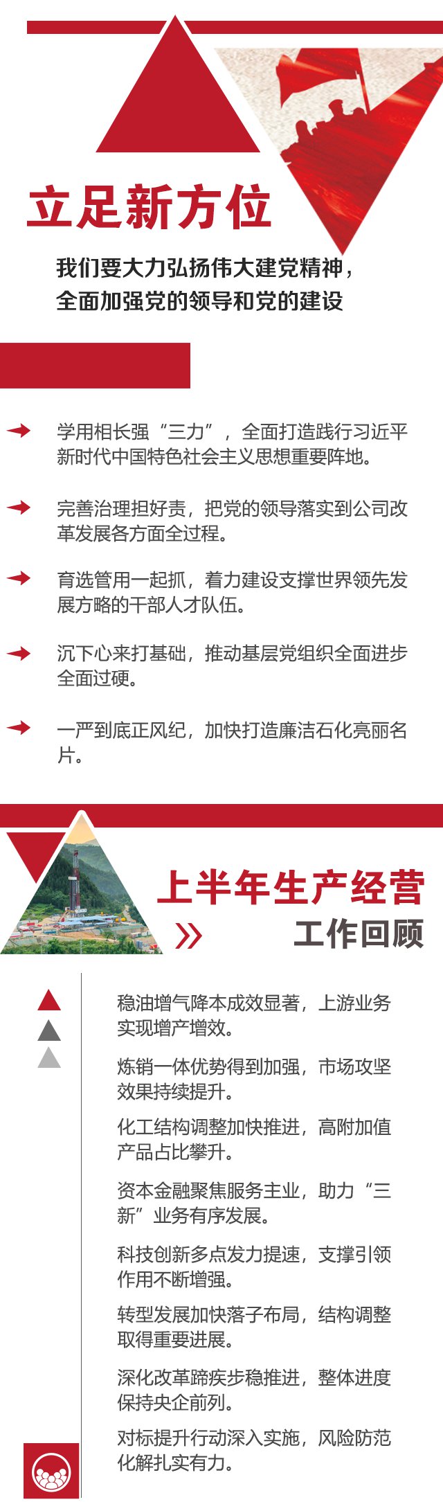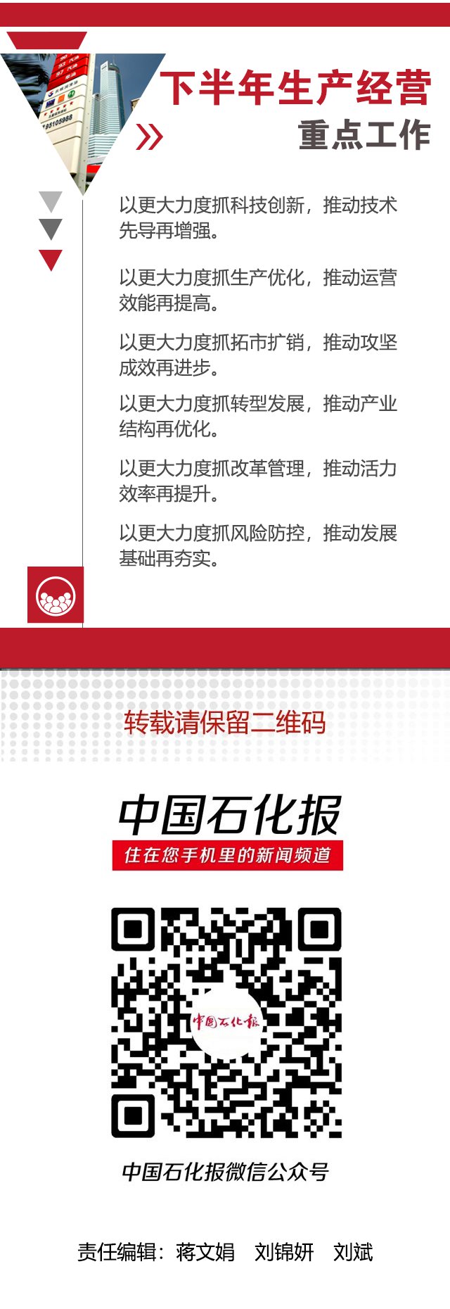 下半年重點做好以下工作:以更大力度抓科技創(chuàng)新,堅持“四個面向”,發(fā)揮國家戰(zhàn)略科技力量作用,落實高水平科技自立自強要求,深入推進(jìn)體制機制改革,聚力攻堅關(guān)鍵核心技術(shù),加快推進(jìn)“兩化”深度融合,牢牢把握創(chuàng)新主動權(quán)、發(fā)展主動權(quán),推動技術(shù)先導(dǎo)再增強。以更大力度抓生產(chǎn)優(yōu)化,上游業(yè)務(wù)要全力抓好油氣增儲上產(chǎn),煉油業(yè)務(wù)要全力抓好產(chǎn)品結(jié)構(gòu)調(diào)整,化工業(yè)務(wù)要全力抓好裝置高效運轉(zhuǎn),推動運營效能再提高。以更大力度抓拓市擴銷,成品油銷售要全力趕超量效進(jìn)度,天然氣銷售要全力推進(jìn)穩(wěn)量增效,化工銷售要全力開拓市場,工程技術(shù)服務(wù)要全力拓展優(yōu)質(zhì)市場,煉油銷售要努力提升市場主導(dǎo)權(quán)和引領(lǐng)力,潤滑油要力爭高端潤滑油脂新領(lǐng)域?qū)崿F(xiàn)新突破,催化劑要打造差異化增值服務(wù),推動攻堅成效再進(jìn)步。以更大力度抓轉(zhuǎn)型發(fā)展,牢牢把握“十四五”發(fā)展機遇,聚焦構(gòu)建“一基兩翼三新”產(chǎn)業(yè)格局,抓好戰(zhàn)略規(guī)劃落實,抓好重點項目建設(shè),抓好“三新”業(yè)務(wù)拓展,推動產(chǎn)業(yè)結(jié)構(gòu)再優(yōu)化。以更大力度抓改革管理,全力推動改革向深層次邁進(jìn),全力推進(jìn)企業(yè)管理水平提升,推動活力效率再提升。以更大力度抓風(fēng)險防控,充分估計困難挑戰(zhàn),切實增強風(fēng)險意識,堅定不移向本質(zhì)安全邁進(jìn),堅持走綠色低碳發(fā)展道路,堅決防范化解經(jīng)營風(fēng)險,推動發(fā)展基礎(chǔ)再夯實。