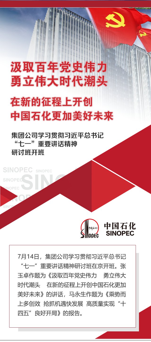 7月14日,中國石化集團公司學(xué)習(xí)貫徹習(xí)近平總書記“七一”重要講話精神研討班在京開班。集團公司黨組書記、董事長張玉卓出席并講話,強調(diào)要認(rèn)真學(xué)習(xí)貫徹習(xí)近平總書記在慶祝中國共產(chǎn)黨成立100周年大會上的重要講話精神,落實中央企業(yè)負(fù)責(zé)人研討班部署,從百年黨史中砥礪初心使命、汲取奮進(jìn)力量,加快發(fā)展育先機,勇立潮頭開新局,奮力打造世界領(lǐng)先潔凈能源化工公司,向著第二個百年奮斗目標(biāo)奮勇前進(jìn),走好新的趕考之路。