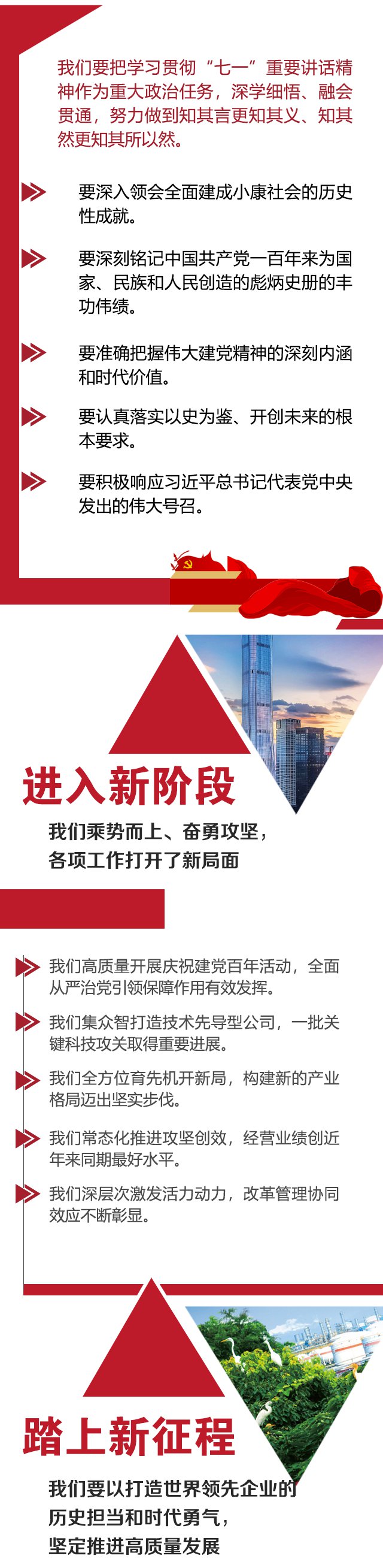 張玉卓說,踏上新征程,我們要以打造世界領(lǐng)先企業(yè)的歷史擔(dān)當(dāng)和時代勇氣,堅定推進(jìn)高質(zhì)量發(fā)展。學(xué)習(xí)貫徹習(xí)近平總書記“七一”重要講話精神,就要用歷史映照現(xiàn)實、遠(yuǎn)觀未來,從過往的奮斗中看清楚過去我們?yōu)槭裁茨軌虺晒Α⑴靼孜磥砦覀冊鯓硬拍芾^續(xù)成功。要以強烈的歷史使命感責(zé)任感,從百年黨史、70余年新中國石油石化工業(yè)史、38年中國石化史中汲取智慧和經(jīng)驗,戰(zhàn)勝前進(jìn)道路上的風(fēng)險挑戰(zhàn),把黨的石油石化事業(yè)推向新境界。歷史告訴我們,黨和國家需要之際,必須聽黨指揮,堅決承擔(dān)起黨和人民賦予的光榮使命;機遇挑戰(zhàn)來臨之際,必須審時度勢,果斷搶占發(fā)展制高點;發(fā)展亟待破局之際,必須科技先行,全力打造技術(shù)先導(dǎo)型公司;形勢深刻變化之際,必須勇于改革,不斷激發(fā)活力動力;隊伍代際接續(xù)之際,必須堅守初心,切實傳承好紅色基因。立足新發(fā)展階段,貫徹新發(fā)展理念,構(gòu)建新發(fā)展格局,推動高質(zhì)量發(fā)展,要求我們從歷史中汲取智慧力量,更好地洞察時代大勢,把握工作主動。要堅持“國之所需”與“企之所能”有機統(tǒng)一;堅持“鞏固傳統(tǒng)業(yè)務(wù)”與“培育三新業(yè)務(wù)”協(xié)同發(fā)力;堅持“大宗強基”與“高端躍升”一體推進(jìn);堅持“雙碳目標(biāo)”與“加快發(fā)展”統(tǒng)籌協(xié)調(diào);堅持“硬實力”與“軟實力”相得益彰,以世界領(lǐng)先賦予“愛我中華、振興石化”新的時代內(nèi)涵,把實干作為本分,永遠(yuǎn)保持清醒頭腦,永遠(yuǎn)保持奮斗韌勁,在新的趕考路上,矢志走到世界一流的最前面。