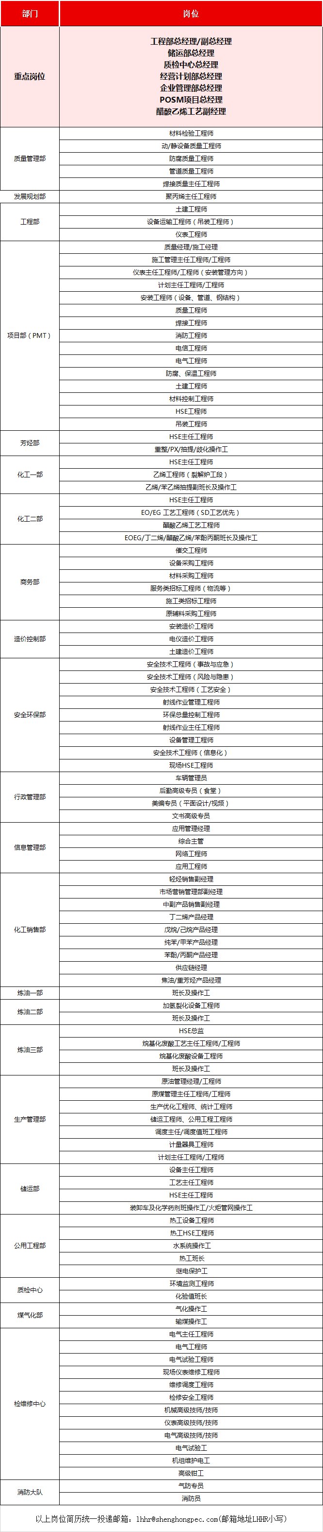 熱招崗位:工程部、經營計劃部、企業管理部、儲運部、質檢中心)總經理、POSM項目總經理、醋酸乙烯工藝經理