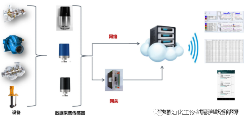 在機泵上安裝便攜式傳感器,用來采集相應數(shù)據(jù)(如:軸承溫度、泵振動值等),傳感器可以采用有限或無線智能傳感器,近幾年無線傳感器技術已相對成熟,無線傳感器具有安裝便捷、快速等特點,結(jié)合設備的重要性和安裝條件,可以綜合考慮無線傳感器與有線傳感器來實現(xiàn)數(shù)據(jù)采集。