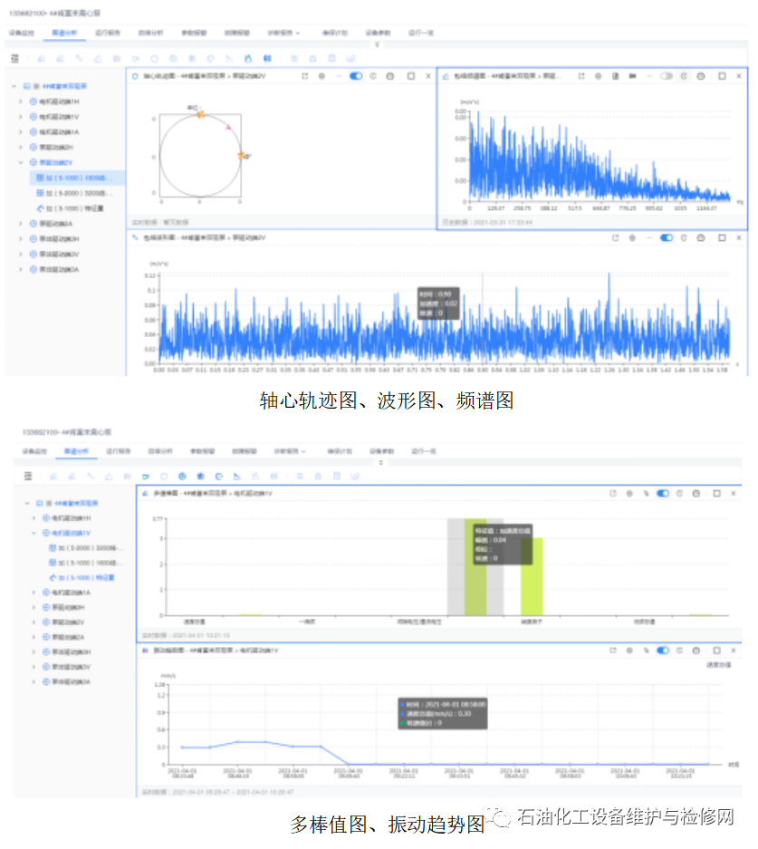 對采集的數(shù)據(jù)(軸承溫度、泵振動等)進行分析,得到變化圖譜,以振動為例,主要對收集的數(shù)據(jù)進一步轉(zhuǎn)化成波形圖和頻譜圖進行分析,得到具體引起振動的原因,有針對性的提前采取預防措施。