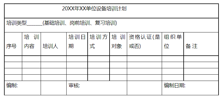 2、各基層單位應(yīng)結(jié)合生產(chǎn)實際及崗位員工對設(shè)備操作及維護技能的需求,有針對性的制定崗位員工的不同類型的年度培訓(xùn)計劃。培訓(xùn)計劃的格式請參考附表。