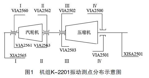 根據結構與振動測點分布,如圖1,利用西安交通大學的RotVIEW9.0富氣壓縮機組K-2201的振動數據進行采集,采用Enpac2500數據采集器及E原monitor V3.7分析軟件。