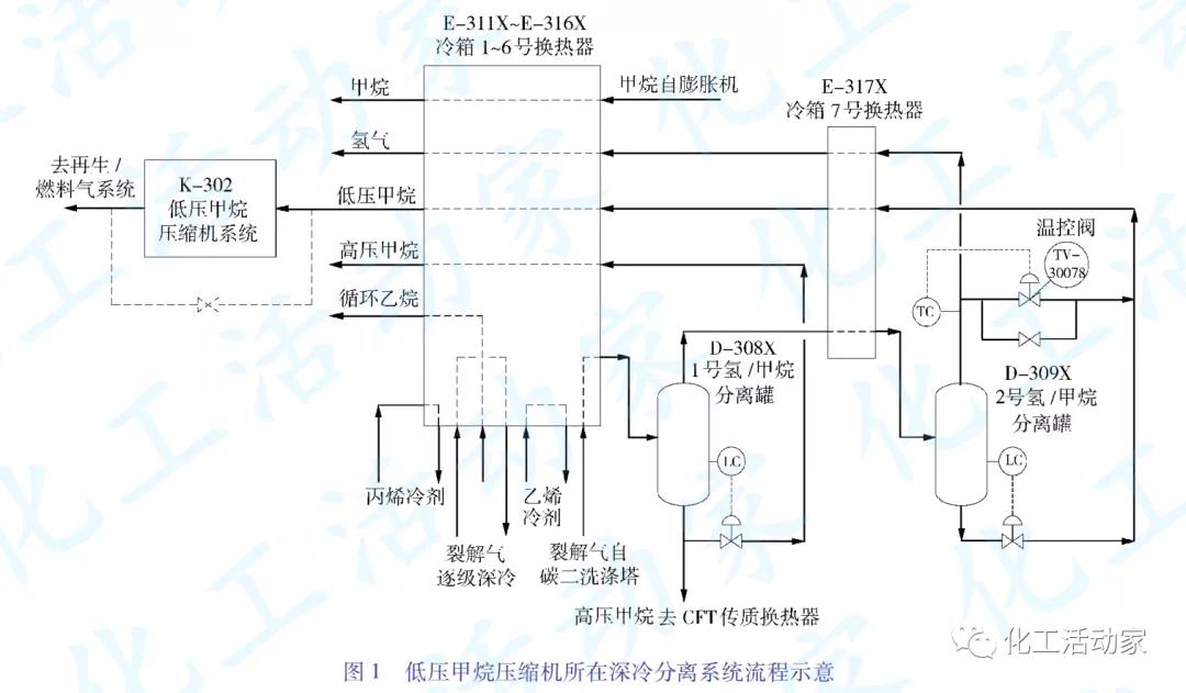 低壓甲烷壓縮機所在深冷分離系統的流程見圖1。
