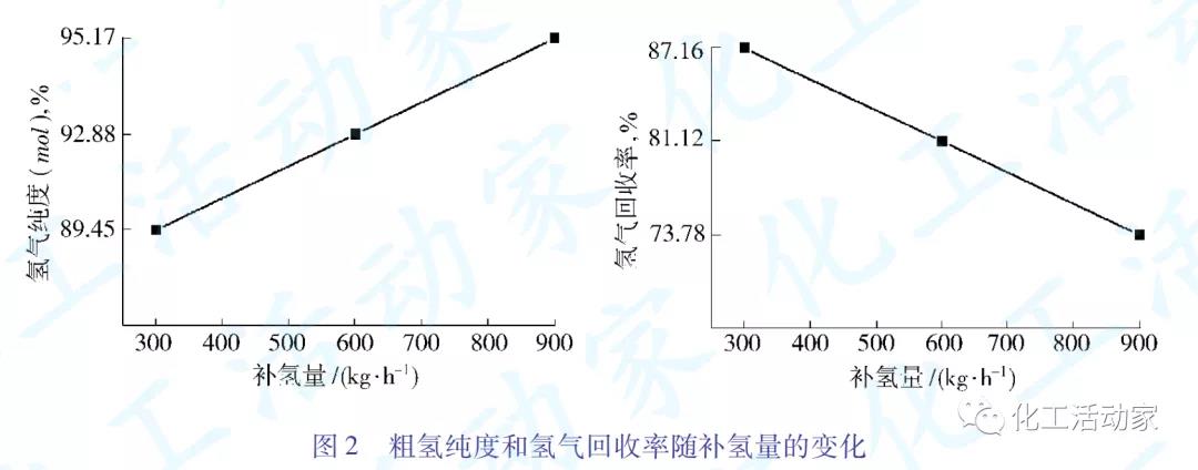 由圖2可知:隨著補氫量的增加,氫氣純度逐漸增大,如要保證氫氣純度(摩爾分數)與原設計一致,仍為95%,補氫量需加大到900kg/h。但增加補氫量會導致氫氣回收率降低,900kg/h的補氫量對應的氫氣回收率低至73.78%。乙烯裝置的氫氣產品除用于碳三加氫外,還送汽油加氫裝置以及聚烯烴裝置,多出部分送至煉油廠。氫氣回收率降低將使氫氣產品的外送量減少,這將影響到煉油裝置的用氫量。根據裝置實際情況,600kg/h補氫量下81.12%的氫氣回收率在可接受的范圍。