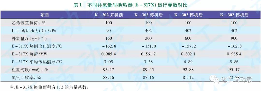 在裝置維持100%負荷情況下,基于E-317X的實際換熱能力,對K-302停機后不同補氫量時E-317X運行參數、粗氫純度和氫氣回收率等進行模擬計算,結果見表1。
