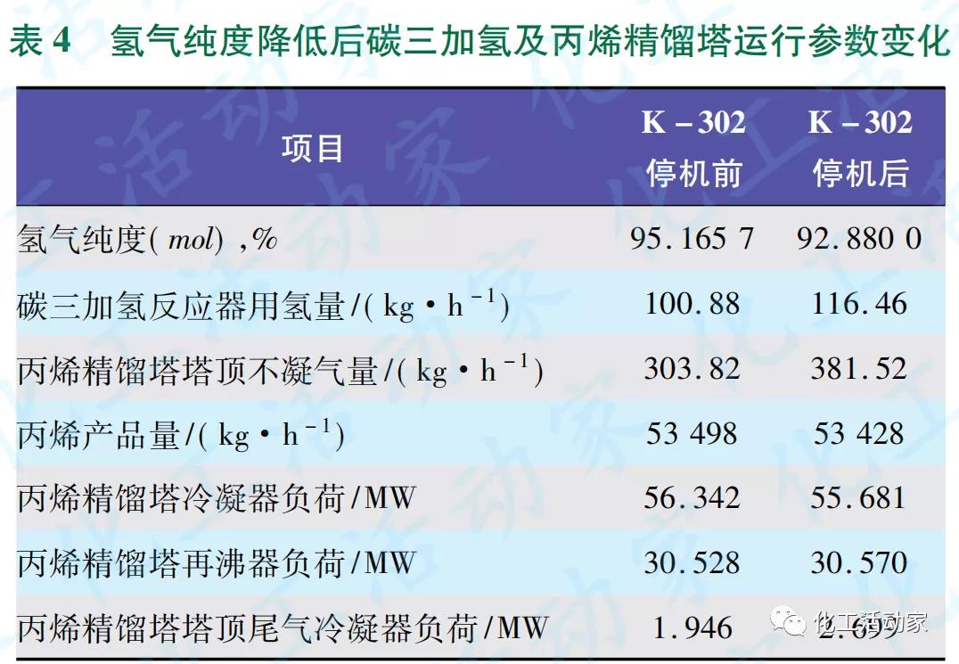 下游聚丙烯裝置的氫氣用量很少,雖然氫氣純度降低,但氫氣產品組分中僅甲烷含量升高,CO、O2等雜質含量無變化,因此對反應幾乎無影響,僅排放量少許增加,對裝置的正常操作無影響。