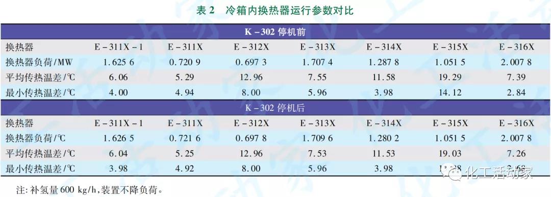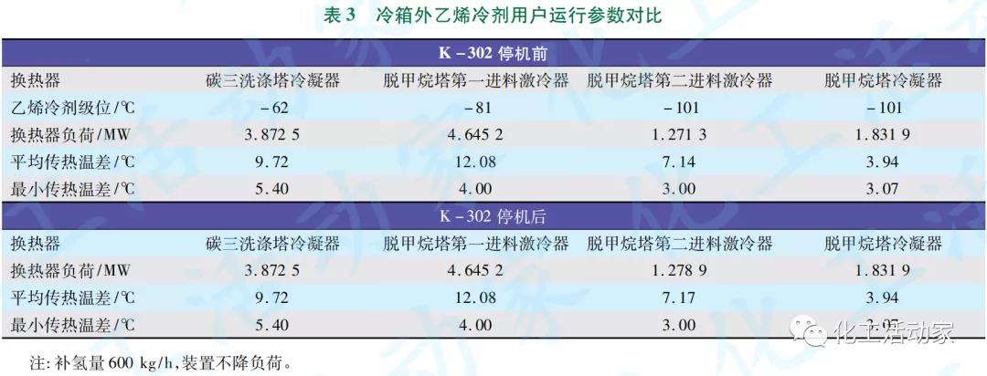 由表2可知:K-302停機后,補氫量增為600kg/h時,冷箱內各板翅換熱器的運行參數變化幅度很小,因此不影響冷箱的正常換熱操作。由表3可知:K-302停機和補氫量的增加對冷箱外乙烯冷劑用戶換熱器的運行參數也無明顯影響,因此也不會影響到乙烯熱泵制冷系統和丙烯制冷系統的正常運行。