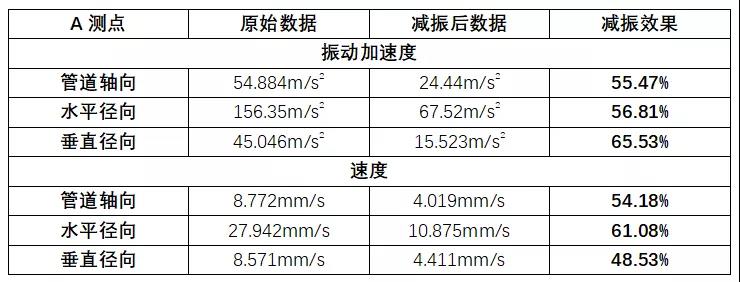 在應用我司粒子阻尼技術后,該項目現場的管道三向加速度、速度有效值均下降至合格范圍(速度值大于20mm/s小于32.4mm/s)內,且大部分數據均達到優秀(速度值小于等于20mm/s),具體數據如下: