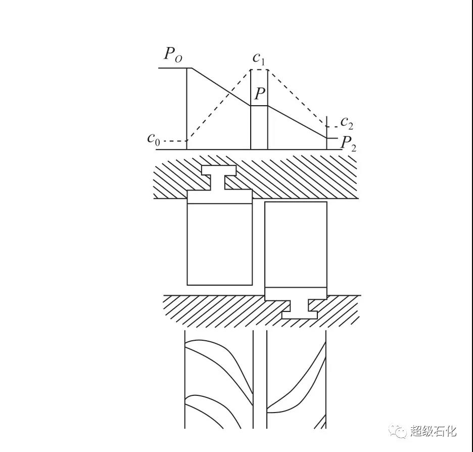 在汽輪機運行過程中末級葉柵所處環境壓力低,溫度低濕含量最大,形成液滴的直徑也最大。蒸汽在級中流動,壓力和速度變化如圖2 所示,在靜葉片中速度逐步上升,壓力逐漸下降,在靜葉片出口速度到達最大值,蒸汽進入動葉片后速度和壓力都逐步下降,所以蒸汽速度最大出現在靜葉片中;同時因動葉片旋轉方向和汽流同向,動葉片和汽流的相對速度比靜葉片小的多,所以靜葉片所承受的沖蝕速度比動葉片大。同時汽流在焊縫處方向改變最劇烈。由此可知汽輪機末級靜葉片焊縫處沖蝕磨損量最大,最終在焊縫處出現宏觀溝槽。