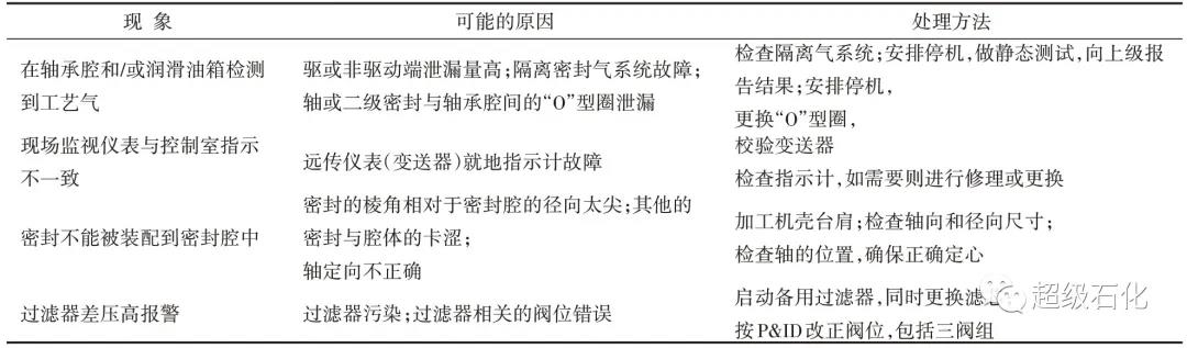 根據(jù)聚乙烯裝置循環(huán)氣壓縮機(jī)周期內(nèi)出現(xiàn)的問題及相應(yīng)檢查記錄,循環(huán)氣壓縮機(jī)干氣密封在正常狀態(tài)運(yùn)行情況下,需要對各控制環(huán)節(jié)的儀表設(shè)備進(jìn)行日常維護(hù)記錄工作,以保證系統(tǒng)運(yùn)行正常。在出現(xiàn)故障情況下,通過故障檢查表對相對應(yīng)的故障及時診斷處理。