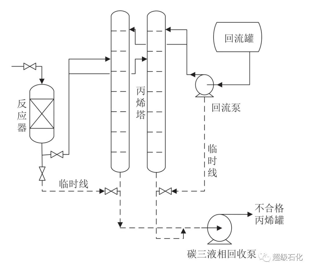 分離單元停工后,受雙丙烯精餾塔內塔盤積液下落和碳三加氫反應器不允許排放火炬的限制,造成丙烯精餾塔塔釜滿液位和碳三加氫反應器內液相物料無法導液的困難。臨時增加了回收流程,將丙烯精餾塔內、丙烯回流系統和碳三加氫反應器內的碳三液相物料回收至碳三回收泵入口,經泵送出至丙烯不合格罐,完成全部碳三液相物料的回收。增加臨時物料回收流程見圖5。丙烯機作為最后停工的部分保持低負荷至無負荷運轉,在無負荷運轉情況下,通過調整收集各段間罐液相丙烯至丙烯機一段罐,通過丙烯回收泵送至丙烯儲罐。