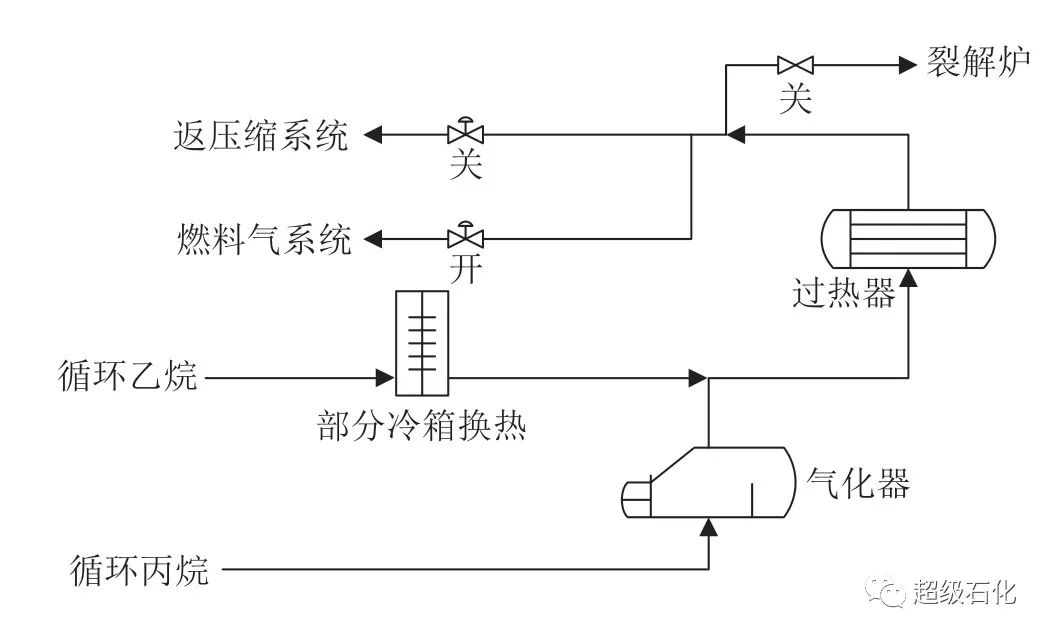 重新設計回收流程,利用乙烯機和乙烯塔熱泵流程,改循環乙烷至裂解爐流程為循環乙烷至燃料氣,首先回收乙烯機和乙烯塔內物料,當回收壓力低于冷分離單元壓力后,打開乙烯塔進料閥門,建立冷分離單元→脫乙烷塔→乙烯機→燃料氣流程。