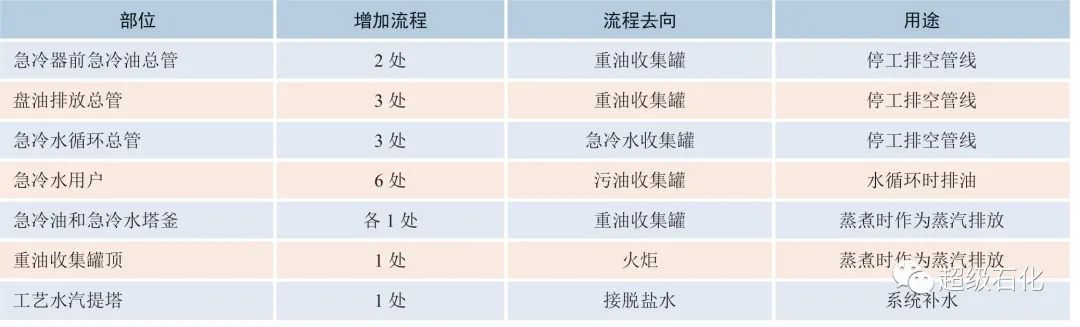 增加急冷油、盤油用戶和管線低點、盲點停工倒空臨時流程,為系統倒空置換作好準備。增加急冷油和急冷水塔化學清洗臨時流程,為急冷單元停工交出檢修提供條件。增加重油收集罐蒸汽排放臨時流程,為急冷油塔蒸煮做準備。增加急冷水用戶和管線高點排油臨時流程,為完成急冷水系統倒空做準備。同時增加工藝水汽提塔補充脫鹽水流程,為工藝水系統單獨循環做準備。急冷系統增加的臨時流程見表1。