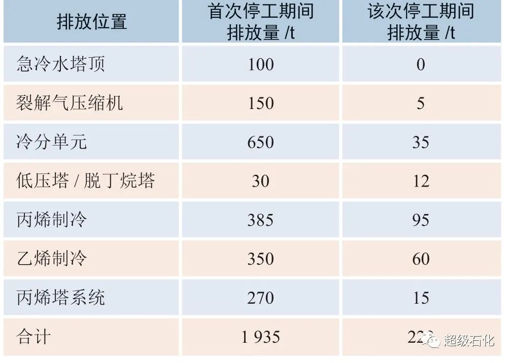 與首次停工檢修相比,烴類物質的回收量顯著提高,該次烴類排放量222 t,比首次停工降低1 713 t,在準備停工退出第一臺裂解爐后的48 h內,首次停工火炬排放平均值為41 t/h,而該次停工僅為5.6 t/h,平均減排35.4 t/h。
