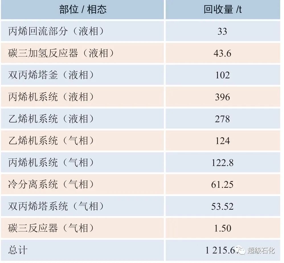 裝置停工后,碳二、碳三系統及兩臺制冷機組物料回收共計1 215.67 t,回收情況見表2。