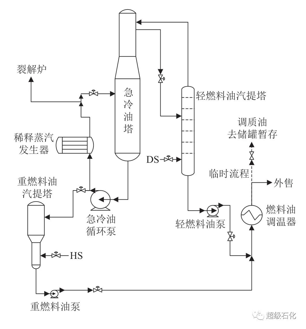 完成化學清洗后,急冷油塔停工,切換熱備爐裂解氣大閥入急冷單元,利用熱備蒸汽對急冷油塔進行蒸煮,同時分批次投用急冷油、盤油用戶和管線低點、盲點停工倒空臨時流程和重油收集罐蒸汽排放臨時流程,完成急冷油塔和兩級油系統蒸煮、倒空工作。完成急冷油塔蒸煮后,進行急冷水塔的化學清洗和急冷油塔的水淋洗。切斷急冷水和工藝水的聯系,利用工藝水汽提塔補充脫鹽水流程保證稀釋蒸汽發生系統運行,稀釋蒸汽發生器投用MS反加熱流程。