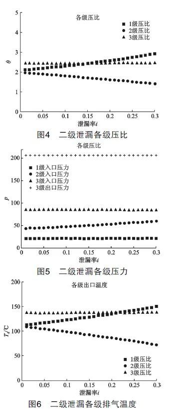 借鑒文獻[4]提供的計算方法,筆者對其泄漏影響規律進行了仿真計算,具體計算公式及復算過程,這里不再贅述。該模型的邊界及假設條件:(1)不考慮氣閥、活塞環等內漏情況導致的氣體溫升;(2)不考慮泄漏時,壓比、溫升對過程指數的影響;(3)壓縮機一級進氣壓力、三級排氣壓力由系統提供,不受漏氣影響;(4)復算精度大于等于0.99時,迭代計算結束。