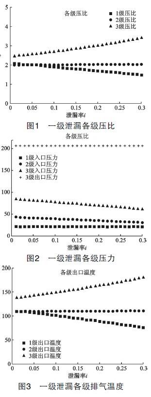 容積流量作為壓縮機最核心的技術參數,API618[5]明確提出“允許的往復壓縮機標準工業偏差依3%適用于流量和壓縮機軸功率”,因此筆者將壓縮機泄漏率的研究范圍確定為該偏差的10倍,詳細研究隨著泄漏率從0~0.3逐漸變化,各級壓力、進排氣壓力、排氣溫度的變化規律。
