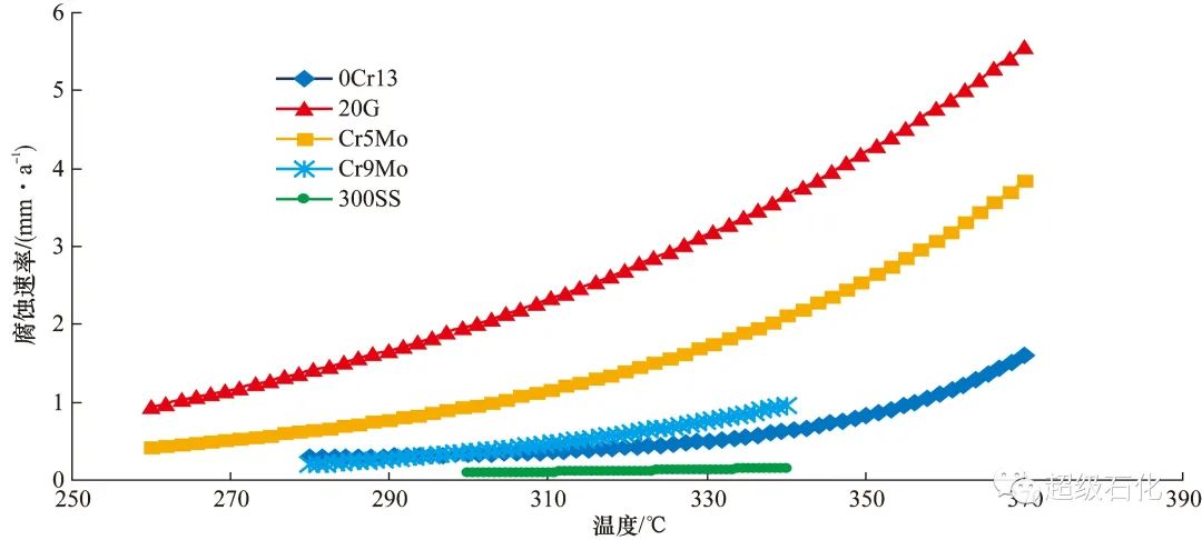 鋼材抗高溫硫腐蝕性能隨著鋼材中Cr含量的提高而提高。一般認(rèn)為,當(dāng)鋼材中Cr的質(zhì)量分?jǐn)?shù)達(dá)到5%或以上時(shí),減緩了高溫硫腐蝕;Cr質(zhì)量分?jǐn)?shù)在9%~12%時(shí),能夠有效地抑制腐蝕[3]。中石化防腐蝕研究中心對(duì)多種高硫原油進(jìn)行動(dòng)態(tài)腐蝕評(píng)價(jià)與統(tǒng)計(jì),通過擬合得到不同材料在高硫原油中的腐蝕速率與溫度的關(guān)系曲線[4](見圖3)。由圖3可知:在320 ℃溫度條件下1Cr5Mo鋼材已經(jīng)無法滿足裝置長周期運(yùn)行要求,而300系列不銹鋼能夠有效抵抗高溫硫腐蝕。參照SH/T 3096—2012《高硫原油加工裝置設(shè)備和管道設(shè)計(jì)選材導(dǎo)則》,當(dāng)介質(zhì)溫度不低于288 ℃時(shí),建議減三線洗滌油管道材質(zhì)升級(jí)為06Cr18Ni11Ti。