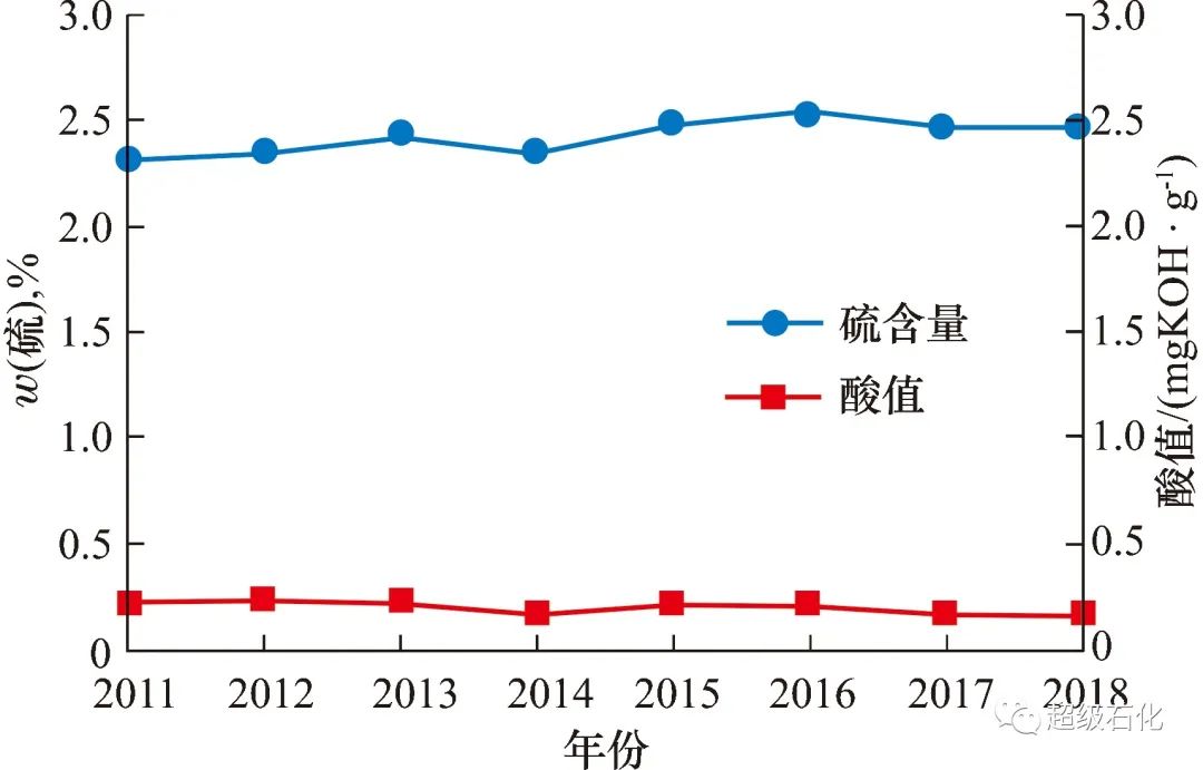 通過該煉油廠相關(guān)統(tǒng)計(jì)數(shù)據(jù)分析,繪制2011年至2018年兩個(gè)生產(chǎn)周期加工原油中硫含量、酸值以及餾分油中硫分布分別見圖1和圖2。