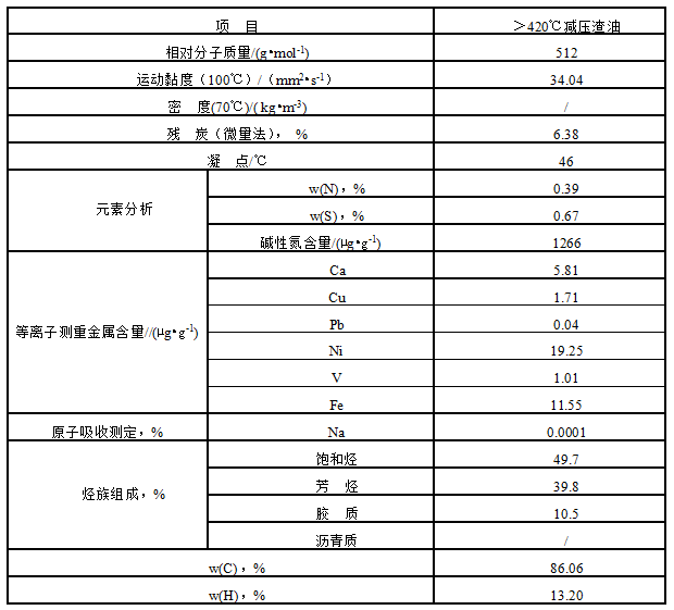 原料殘?zhí)枯^高,烴族組成中飽和烴含量較低、芳烴含量較高。說明該原料具有較高的生焦趨勢;催化汽油高辛烷值易保證;原料較難裂化,反應應采用較高的苛刻度。