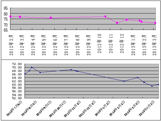2013年年初,對新鮮劑活性進行了調(diào)整,將以往高活性(初始活性78左右)的新鮮劑調(diào)成為低活性(初始活性70~75)的新鮮劑,通過對新鮮劑活性的調(diào)整,平衡劑活性逐漸調(diào)整到60~64,裝置操作彈性明顯改善。