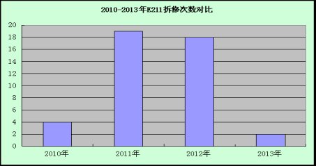 催化油漿蒸汽發(fā)生器E211檢修頻次顯著下降。自2010年大檢修開工以來,E211檢修次數(shù)由2013年以前的共計41次降低到2013年全年僅2次。E211拆修次數(shù)對比見圖10。